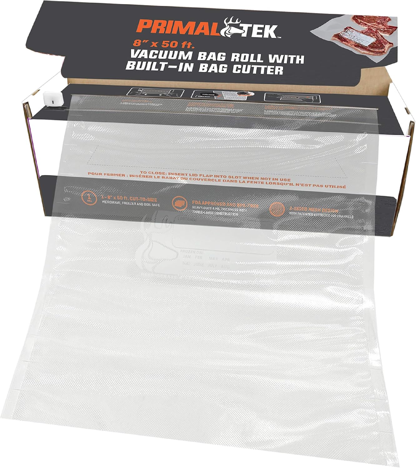 - EASY TO CUT AND SEAL – Make meal prep faster and easier with the PrimalTek Vacuum Bag Roll with Built-In Bag Cutter. This box contains one, 8in x 50ft long freezer bag that easily rolls out and cuts to size with the integrated cutter on the box.